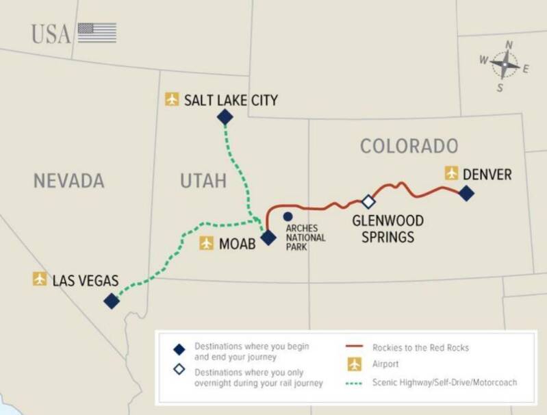 Nieuw sinds augustus 2021: de luxe dagtrein rocky mountaineer rijdt nu ook in amerika en wel op een 2-daagse reis in spectaculair landschap tussen denver en de plaats moab (dicht bij de nationale parken arches en canyonland). halverwege is een hotelovernachting in glenwood springs inbegrepen.